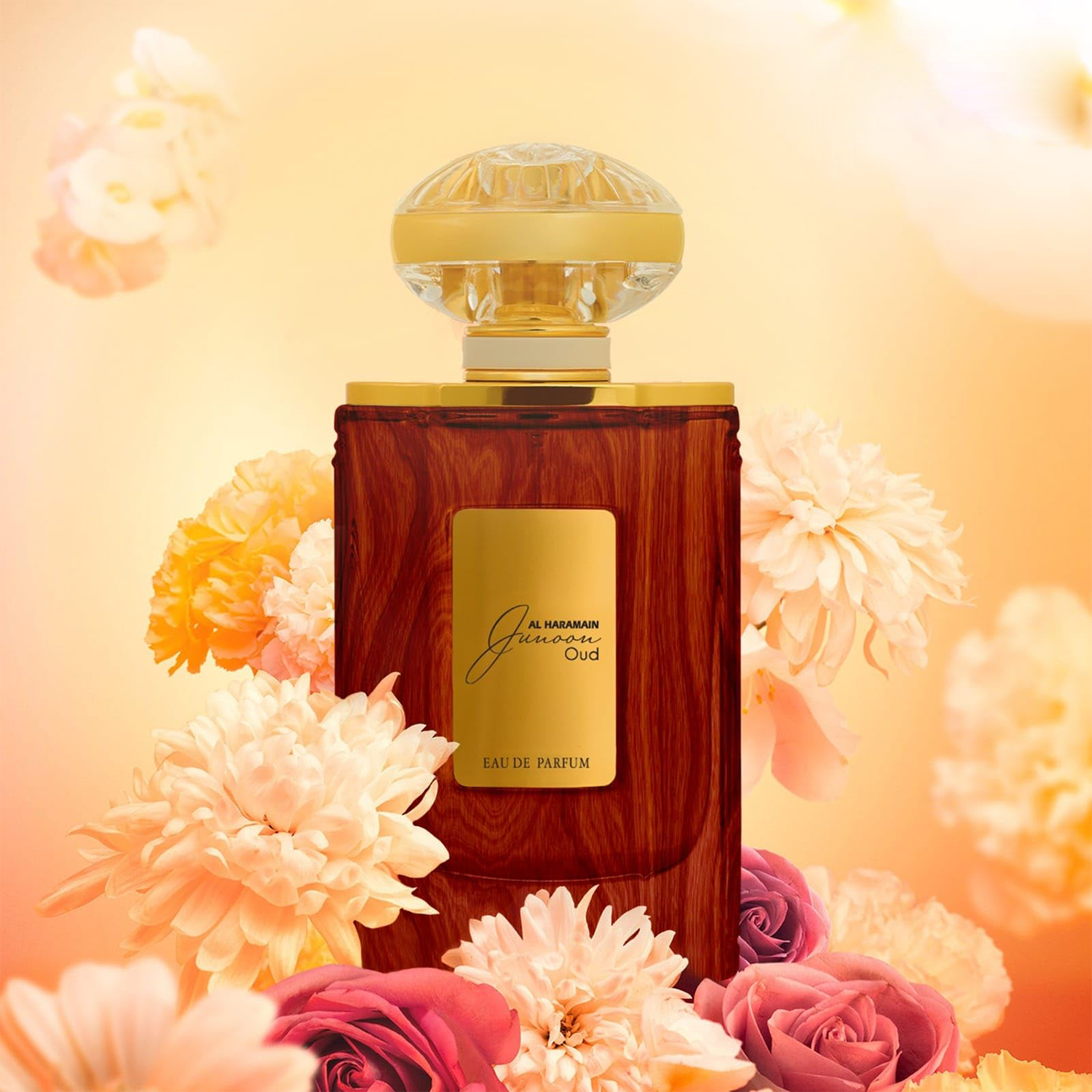 Al Haramain Junoon Oud EDP has a rich and captivating scent that combines deep, warm notes of oud wood with sweet hints of caramel and floral undertones, creating a luxurious and exotic aroma.
