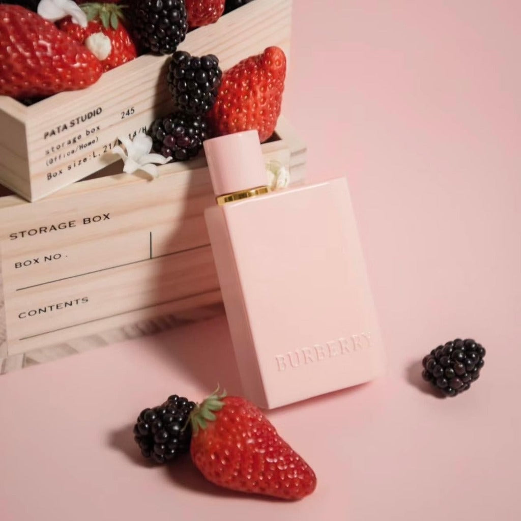 Burberry Her Elixir De Parfum EDP Intense smells like a rich and fruity blend of juicy berries, warm amber, and a hint of creamy vanilla, creating a luxurious and vibrant scent.
