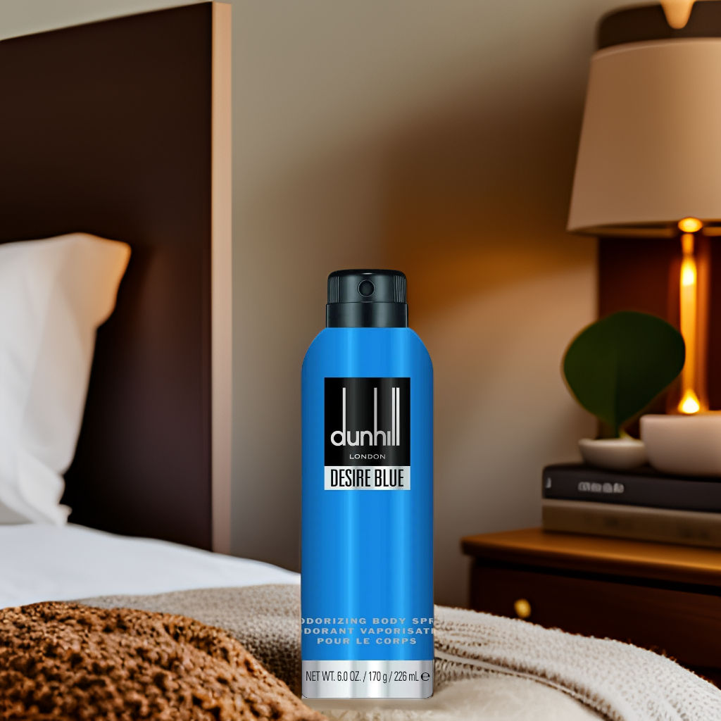 The Dunhill Desire Blue Deodorant Body Spray smells like a fresh ocean breeze mixed with citrus and wood – a crisp scent for the adventurous man.
