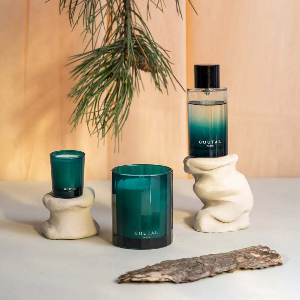 The Goutal Une Foret D'Or Green Scented Candle smells like a cozy winter forest walk, with fresh pine and a hint of sweet oranges and mandarins.