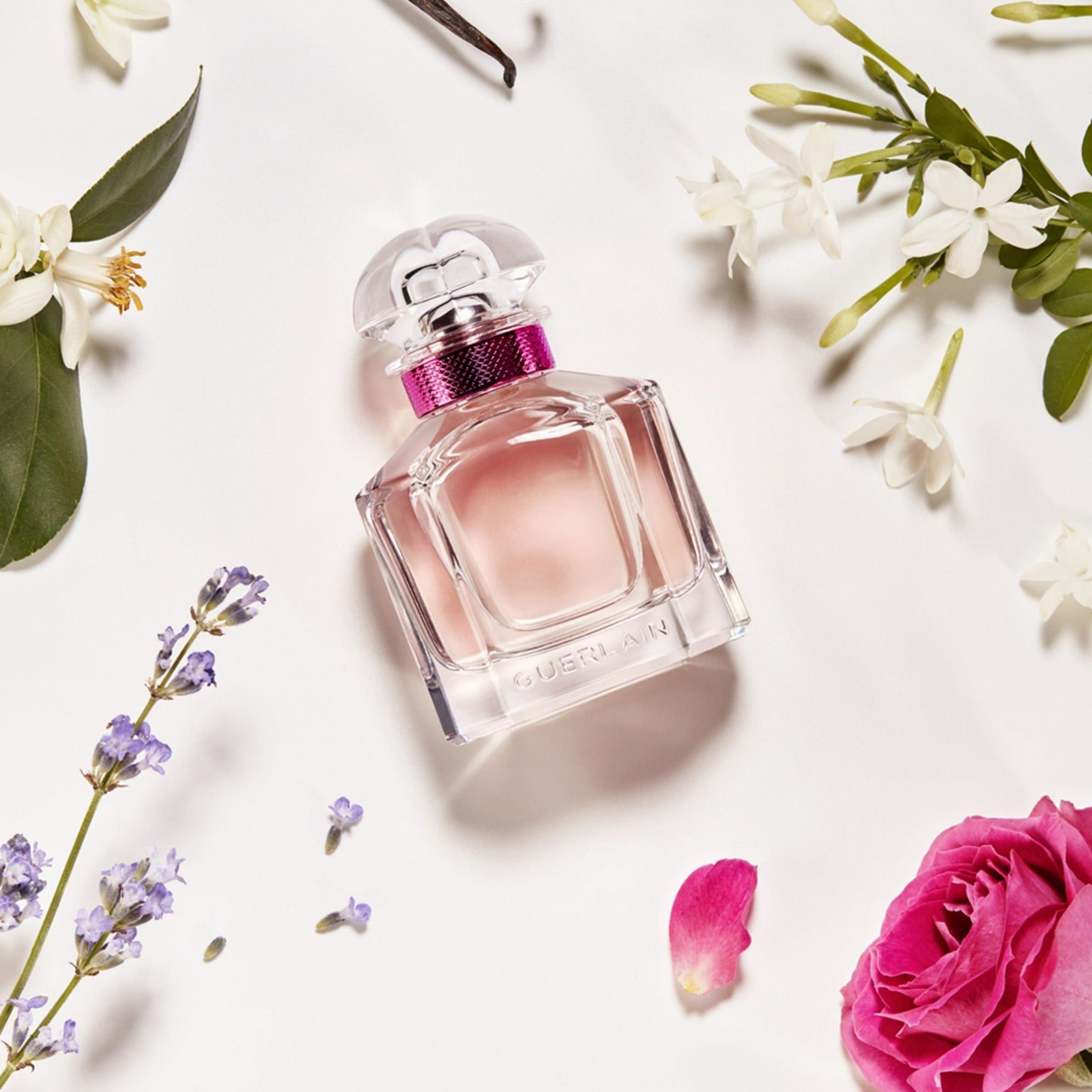 Guerlain Mon Bloom Of Rose EDP exudes a passionate elegance with a blend of fresh Carla lavender, exotic Sambac jasmine, sweet Tahitian vanilla, and warm sandalwood, inspired by Angelina Jolie's timeless femininity.