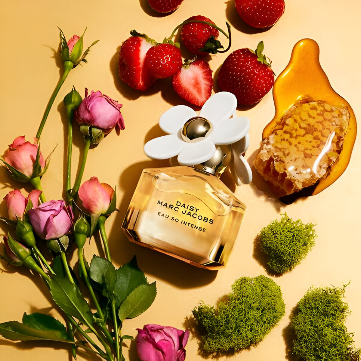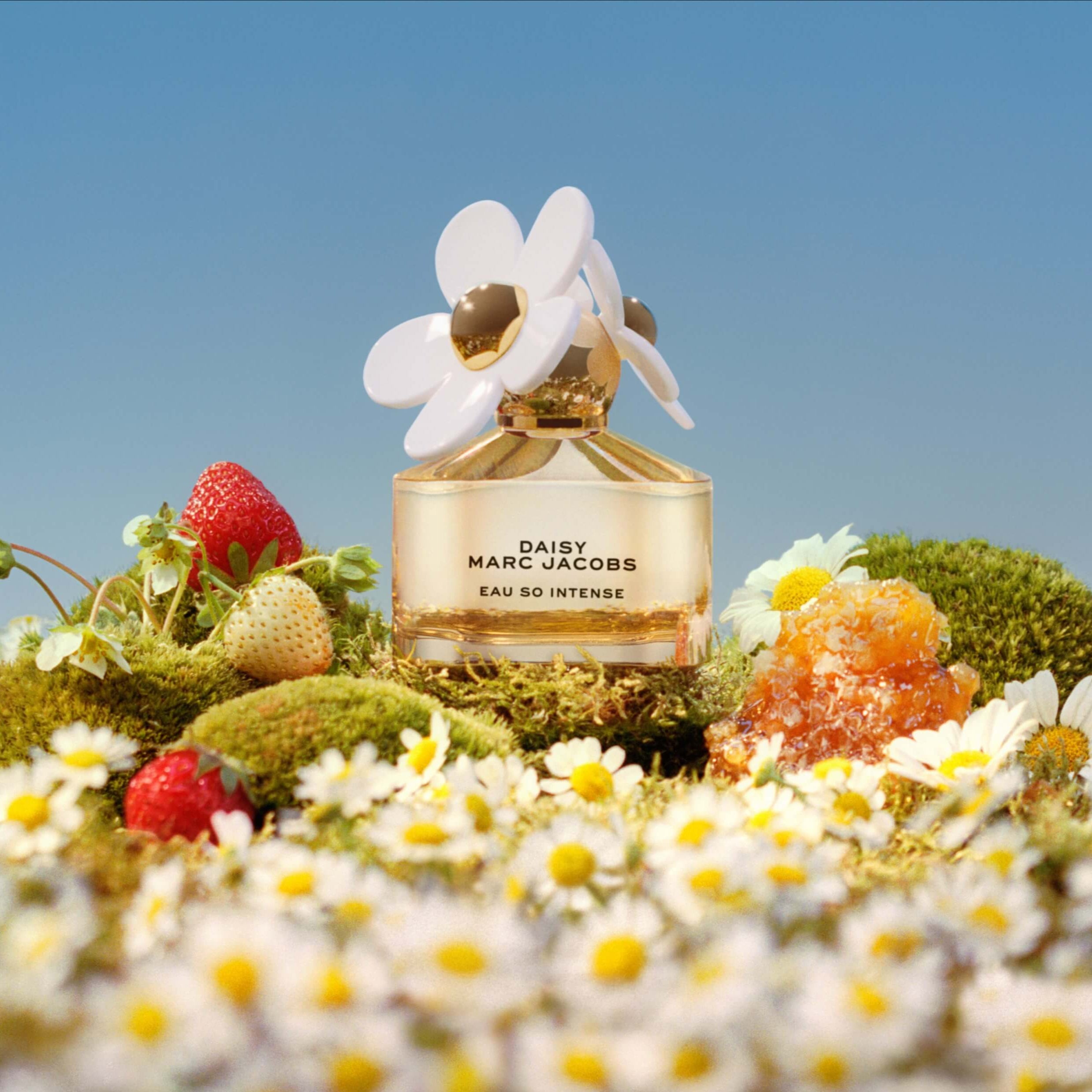 Marc Jacobs Daisy Eau So Intense EDP smells like a delightful mix of sweet wild strawberry, fresh violet leaves, and soft jasmine, all rounded off with a warm touch of vanilla, creating a rich and joyful fragrance that feels like a beautiful sunset.