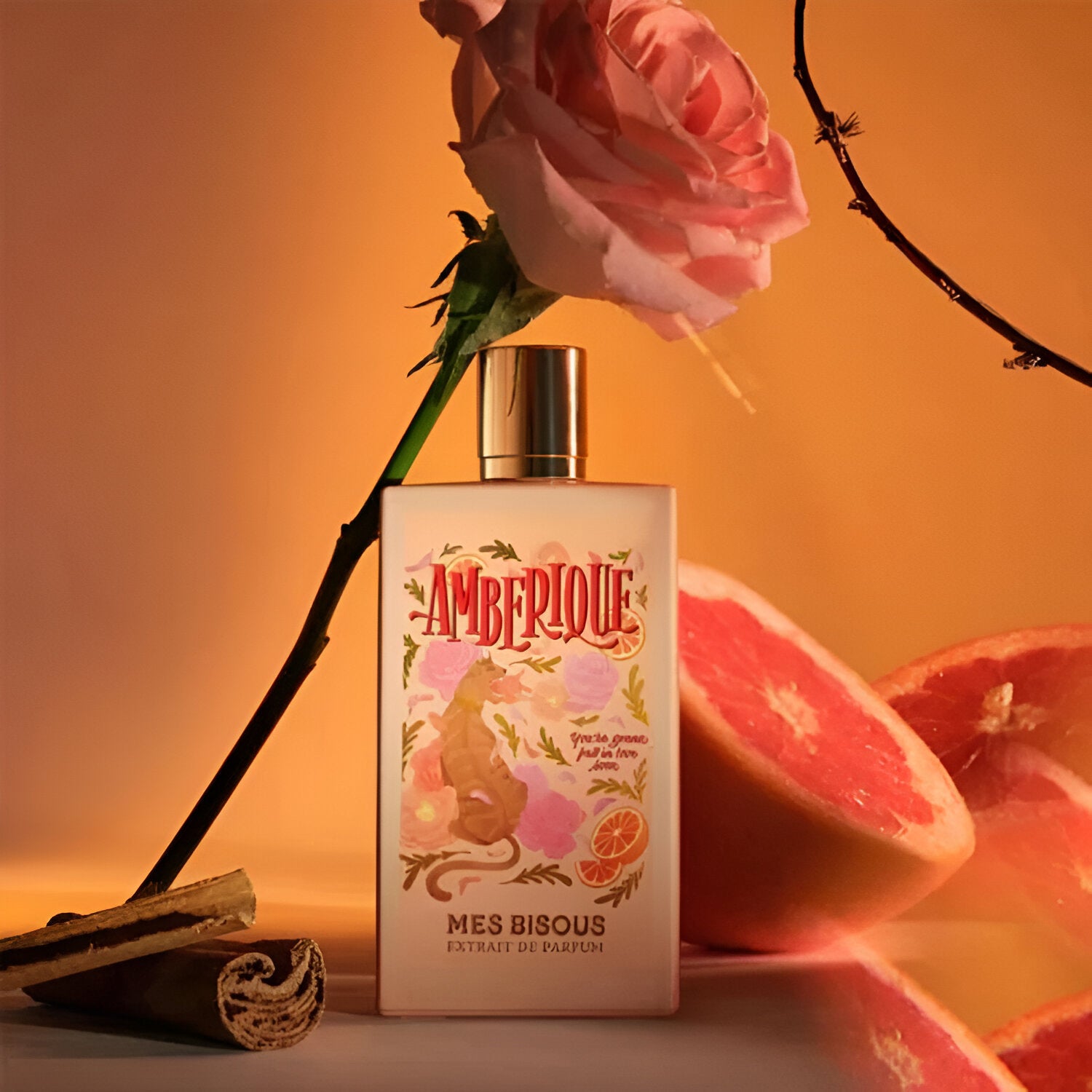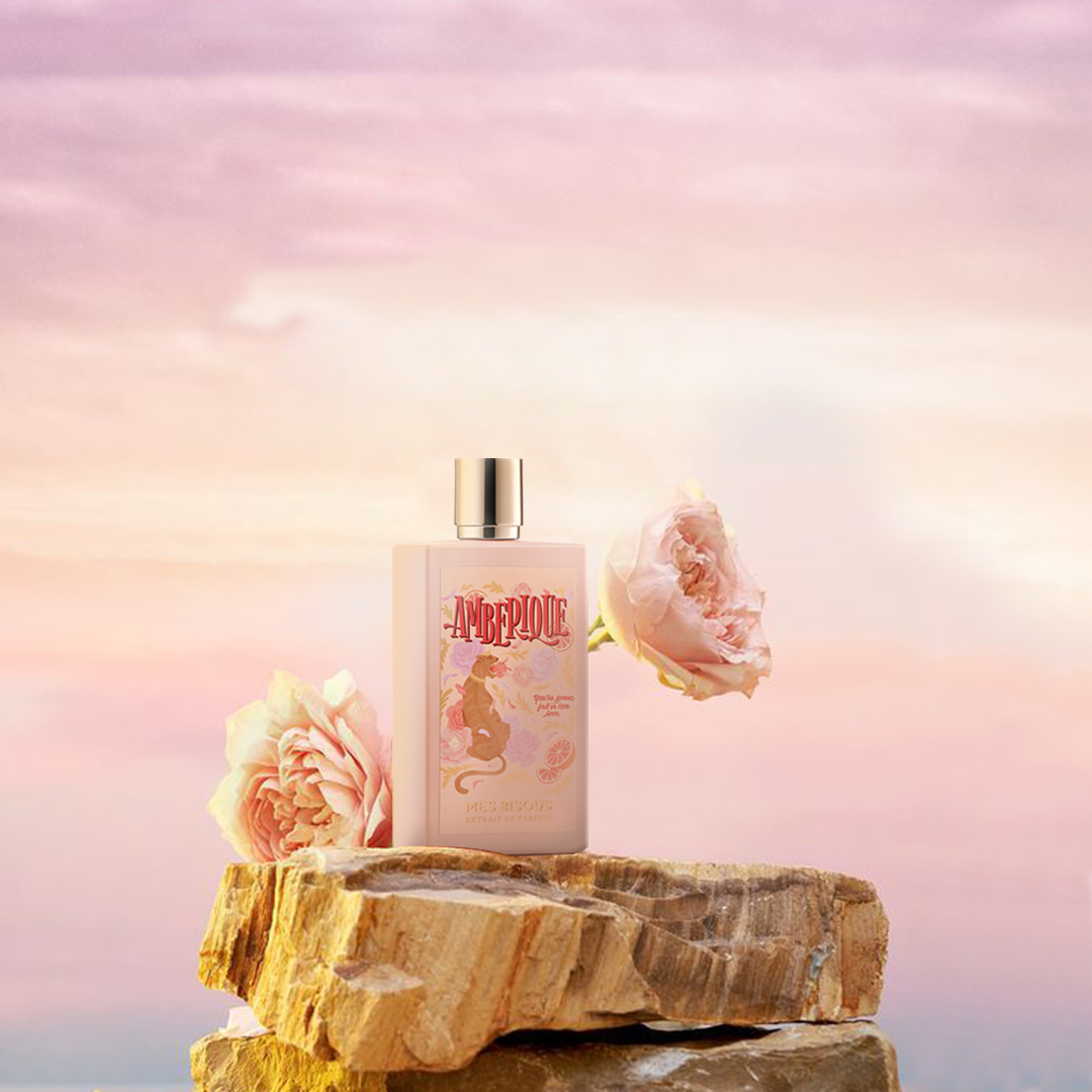 Mes Bisous Amberique Extrait De Parfum smells like a warm and seductive blend of fresh grapefruit, romantic rose, spicy pink pepper, and rich amber, all wrapped in a hint of cinnamon that sparks deep emotions and tells a captivating story.