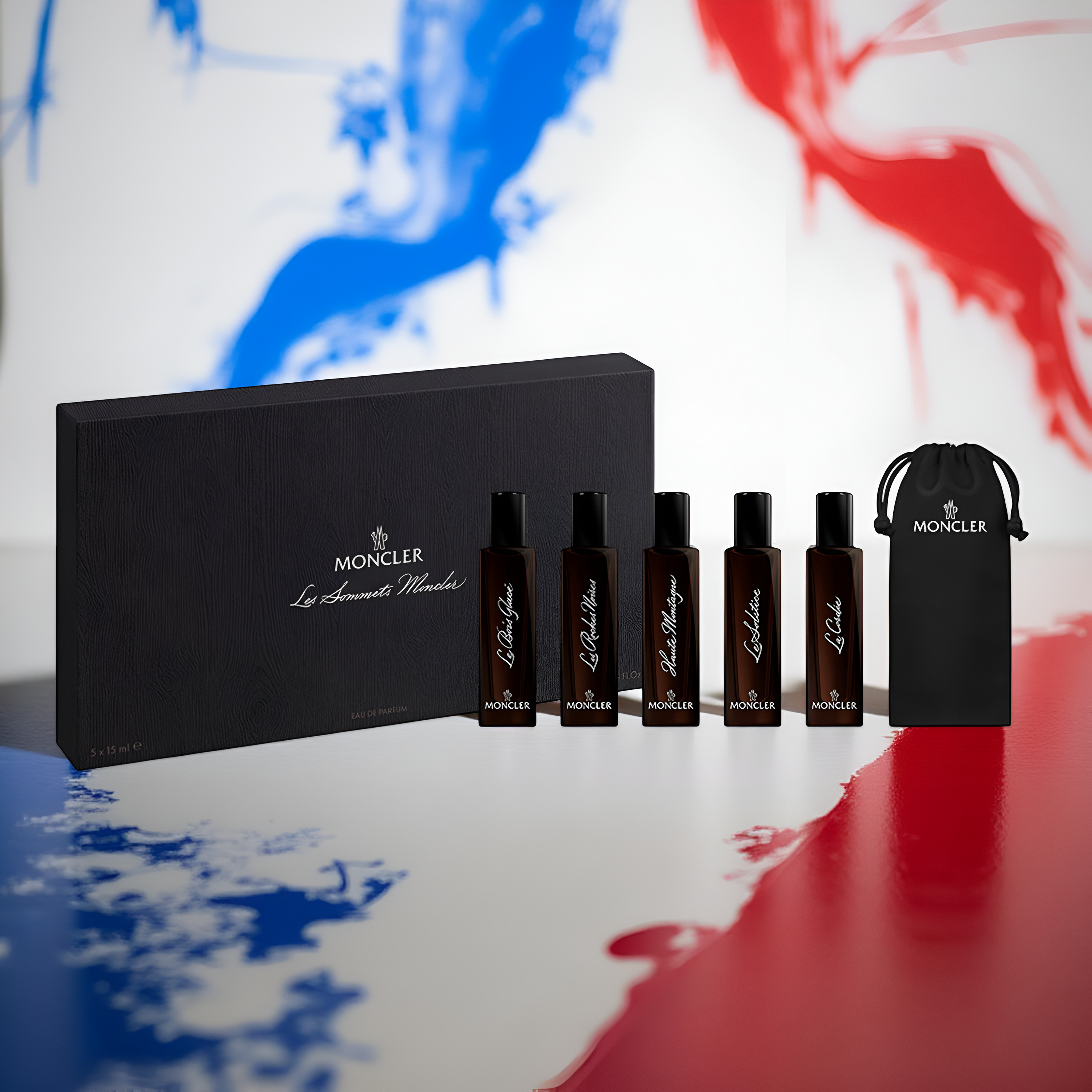 - What's inside: 15ml Moncler Le Bois EDP Travel Spray, 15ml Moncler Les Roches EDP Travel Spray, 15ml Moncler Haute Montagne EDP Travel Spray, 15ml Moncler Le Solstice EDP Travel Spray, 15ml Moncler La Cordee EDP Travel Spray, Travel Pouch