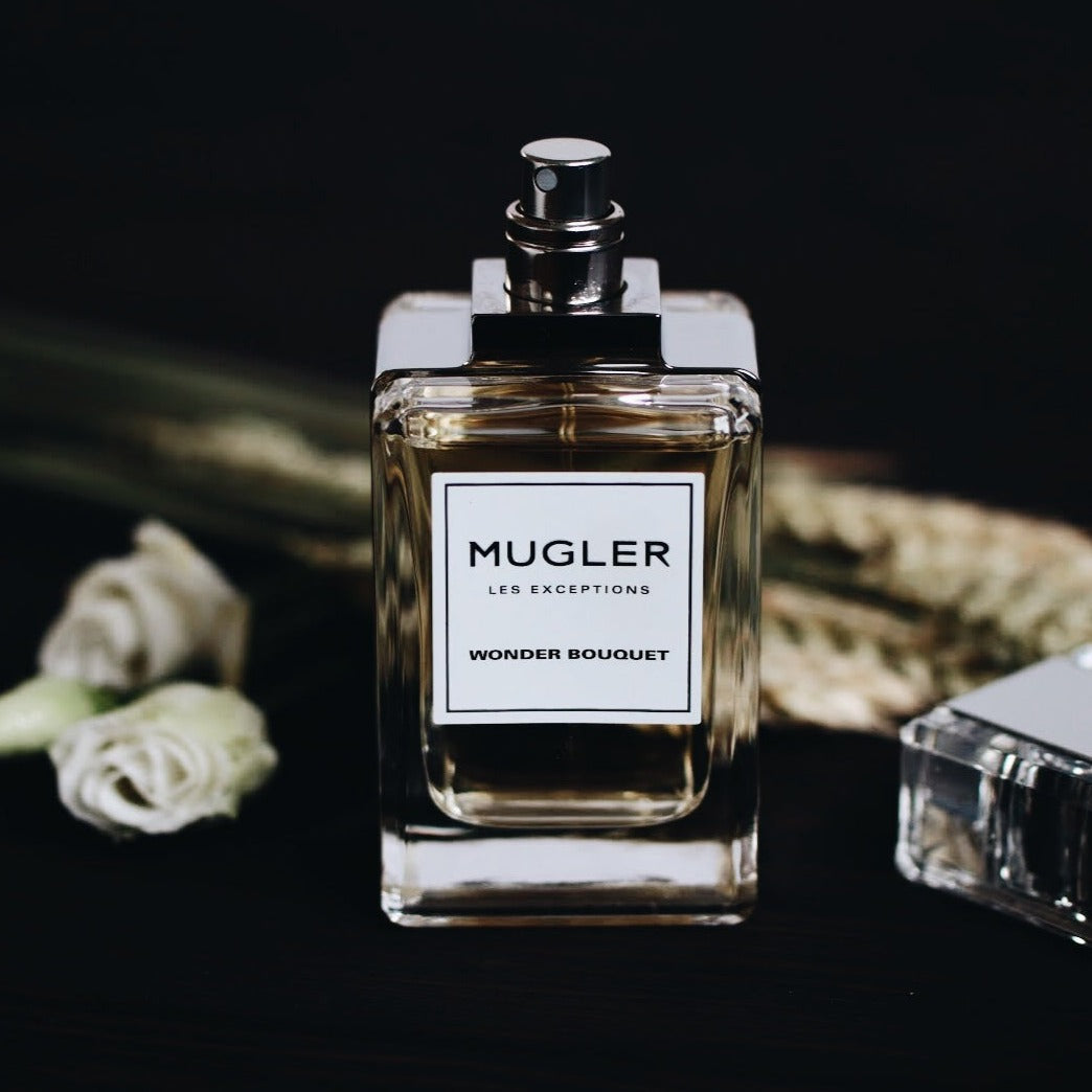 Mugler Les Exceptions Wonder Bouquet EDP smells of orange blossom, lily of the valley, Sambac jasmine, with a hint of beeswax.