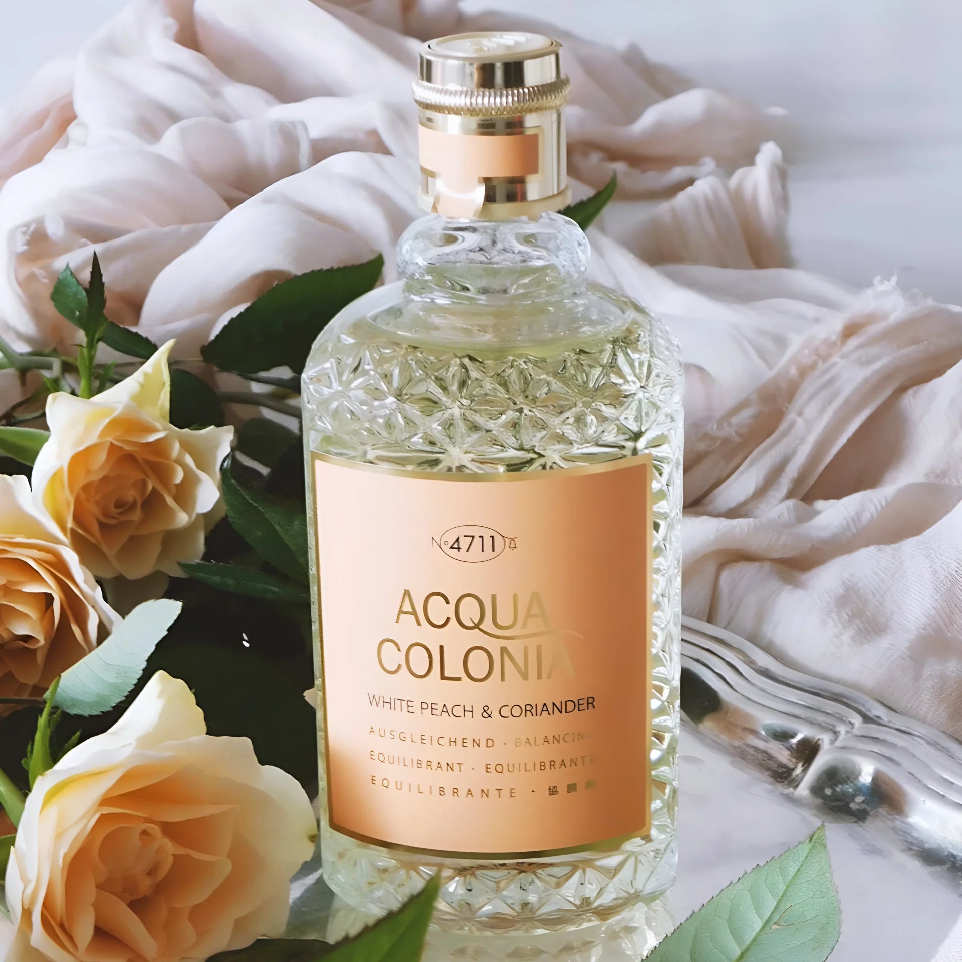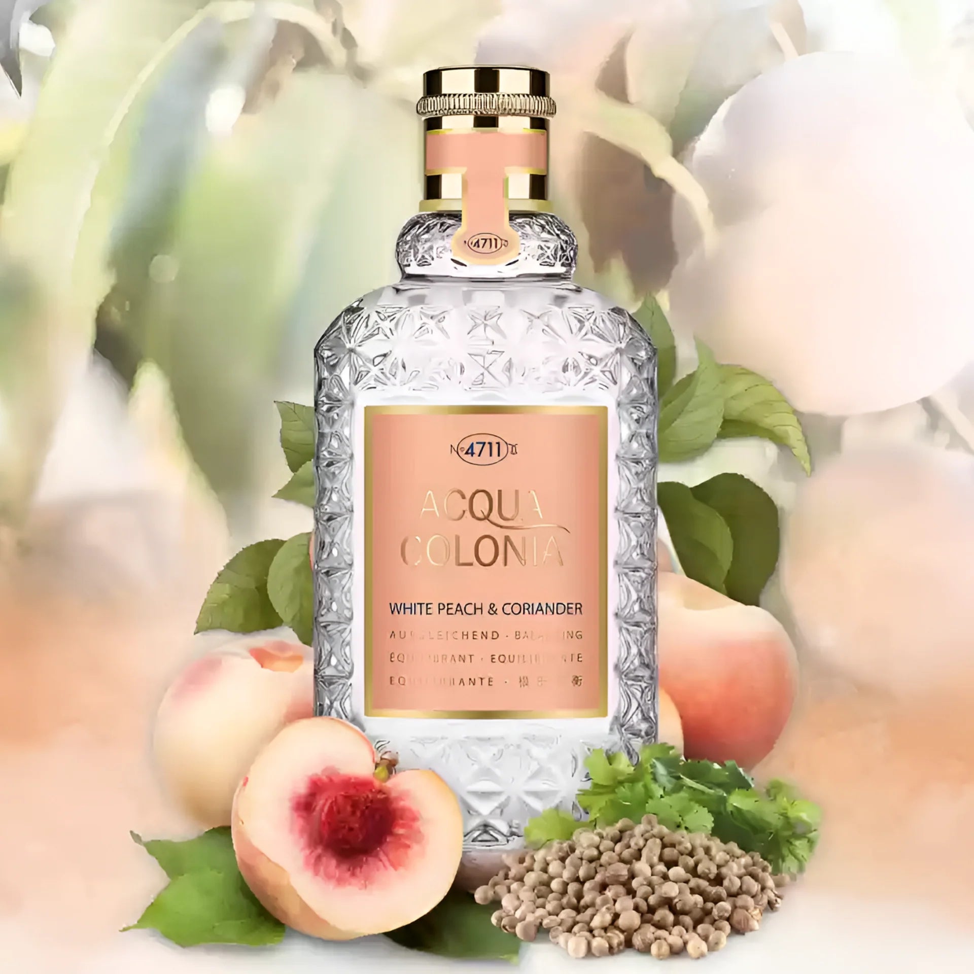 No. 4711 Acqua Colonia White Peach & Coriander EDC is a bright, aromatic fragrance that blends ripe white peach with fresh coriander notes. It balances juicy fruit and green spice for a lively, modern unisex scent.