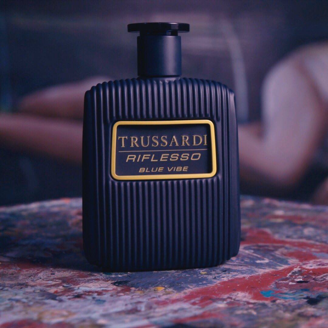 Trussardi Riflesso Blue Vibe EDT smells of geranium, hazelnut, with deep notes of amberwood, tobacco, and Italian leather, capturing a warm, sophisticated Caribbean evening.